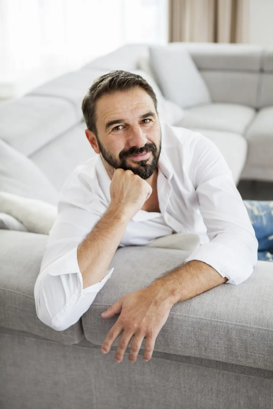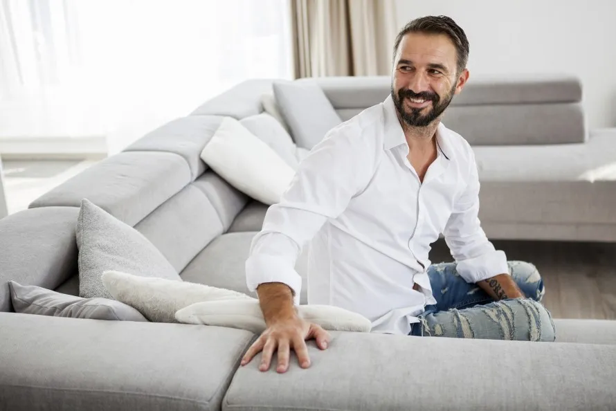 Je to sedačka LAMIA z edície Luxury v tvare U so sivým textilným poťahom. Predtým sme mali menší gauč v tvare L, čiže iba s jednou predĺženou časťou. Takže sme sa často hádali, kto bude sedieť na najlepšom mieste. Teraz môžeme sedieť s vyloženými nohami všetci naraz – aj moja manželka, aj ja. Užívam si aj polohovateľné opierky, ktoré si prispôsobím podľa toho, či pracujem s notebookom, alebo chcem sledovať televíziu. Najdôležitejším kritériom pre výber našej sedačky bolo jednoznačne pohodlie. Je zaujímavé, že pri kúpe sme si vôbec nevšímali bočné opierky. Až neskôr sa ukázalo, že široké opierky sú vlastne fajn. Už len kvôli tomu, že si na ne môžem položiť šálku kávy. Teda, ak už opierku neobsadil náš psík :-)