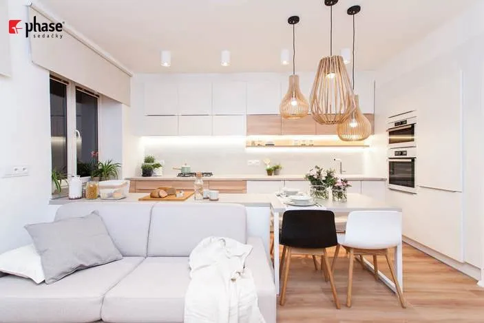 Celkový dizajn interiéru je navrhnutý funkčne a v príjemných naturálnych farbách, ktoré harmonizujú domácnosť. Dôraz sa kládol na kuchyňu, nakoľko obyvateľky bytu rady varia a pečú 😉