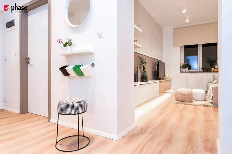Obývacia časť miestnosti je prepojená podlahou spolu s kuchyňou aj chodbou. Interiérový nábytok je v bledom prevedení a doplnky sú ladené do celého štýlu. Farebné spojenie odtieňov béžovej farby, doplnené bielou a k tomu malé detaily so zelenou, vytvárajú príjemnú miestnosť. Výhodou celej miestnosti je veľa svetla a malé detaily, ktoré vytvárajú pohodlie domova.