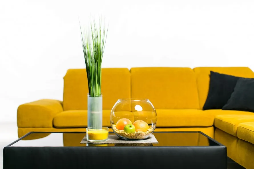 Druhou dekoráciou prinášam opäť spojenie dvoch trendov Enrich a Nourisch, ale v inej variante. Energický trend Enrich ostáva v podobe žltej sedačky a trend Nourisch prinášam v dekoráciách na konferenčnom stole. Stôl dekorujem s modernou čiernou misou, ktorú som doplnila zelenými jablkami. Misa farebne ladí so stolom a tmavými vankúšmi. Zvolila som sklenenú vázu, ktorá je napodobeninou zaváraninovej nádoby. V tejto váze nám vynikne zelený rezaný živý kvet, ktorý pri správnom udržiavaní zotrvá dlhodobo pekný. Je to príjemná živá dekorácia a môžeme si ju priniesť aj z akejkoľvek prechádzky v prírode.