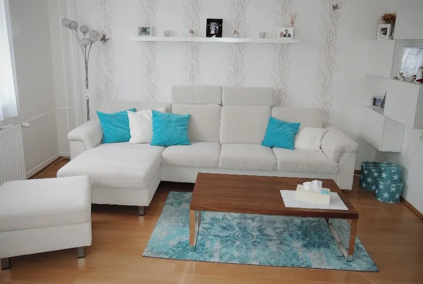Chýba vám ráno energia? Skúste si svetlú obývačku doplniť výraznejšou farbou. Ale zase nie veľmi intenzívnou, aby stále prevládala biela farba, ktorá všetky odtiene v izbe zjednotí. Náš zákazník sa nebál svetlú vytapetovanú stenu a bielu rohovú sedačku skombinovať s jemnými tyrkysovými doplnkami. Takáto svetlá kombinácia ho určite motivuje k aktivite hneď ráno.