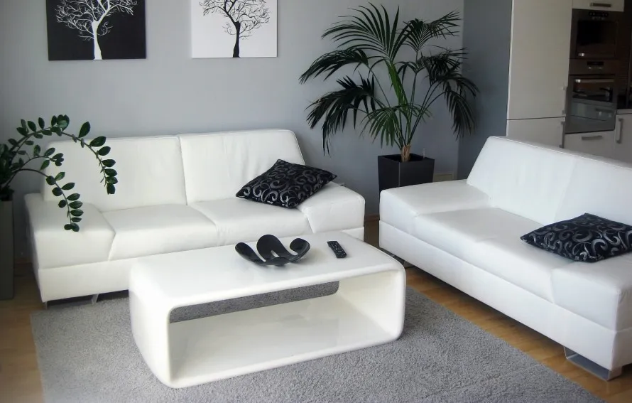 Nie každý sa uspokojí s nežným svetlým interiérom. Milovníci väčšieho vzrušenia môžu jasne vymedziť hranice bielej farby tmavými líniami. Skvelým kontrastom k bielej sú napríklad aj kovové prvky. Náš zákazník vymedzil priestor bielej sedacej súpravy Monaco čiernymi doplnkami a kontrastnými obrazmi na stene.