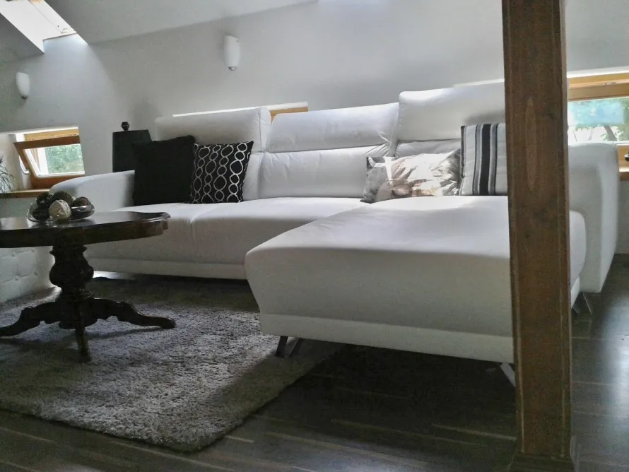 Bielou farbou nič nepokazíte ani na stenách, zvlášť ak máte v miestnosti napríklad drevené trámy alebo rustikálne nábytkové solitéry. Striedanie najrôznejších textúr oživí určite aj váš domov tak, ako v obývačke našich zákazníkov, ktorí zvolili bielu stenu a rohovú sedačku rovnakej farby. Svetlé odtiene zjemňujú drevené trámy a okrúhly starožitný stolík.