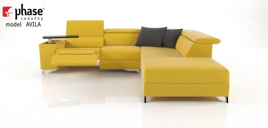 Na obrázku vyššie je sedačka AVILA vyobrazená s funkčným stolíkom a relaxačným polohovacím sedom.