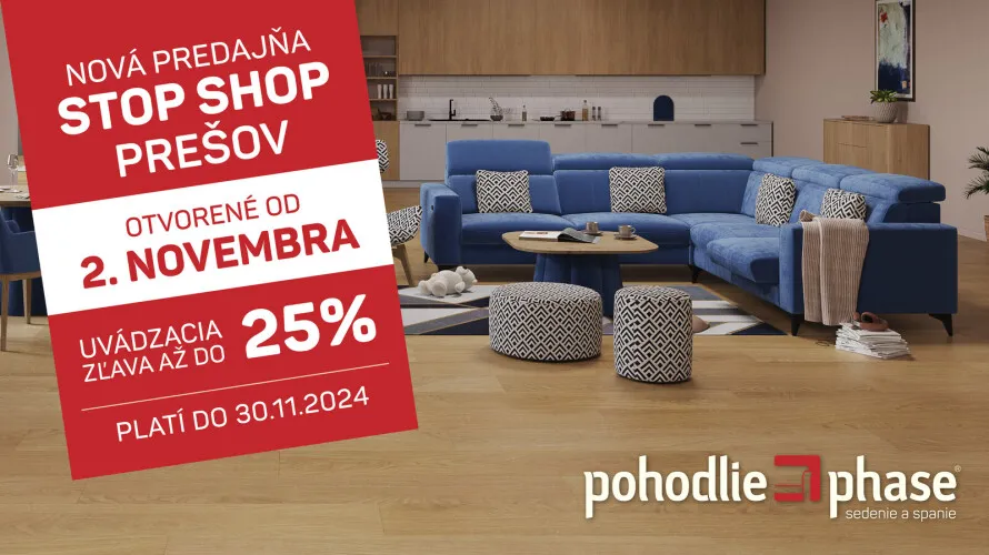 Preto sa na Vás od 2. novembra tešíme v našom showroome POHODLIE PHASE v nákupnom centre STOP SHOP PREŠOV. Zľavy platia od 2. novembra do 30. novembra 2024.