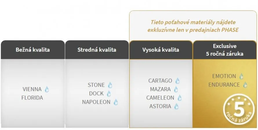 Ďalšou našou obrovskou výhodou sú poťahové materiály, ktoré ponúkame. Tým, že máme veľmi silné postavenie na trhu so sedacím nábytkom, 80 % poťahových materiálov dostávame od našich dodávateľov, ktorí sú z celého sveta, ako exkluzivitu. To znamená, že ich nájdete len v našich predajniach a nie u konkurencie.
